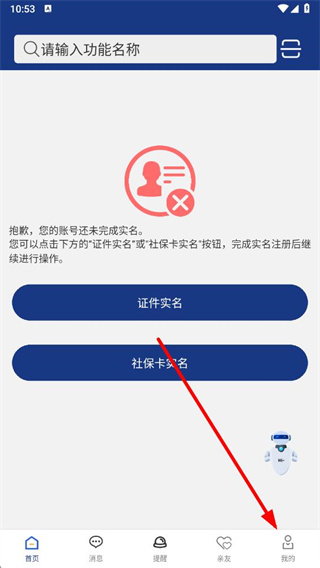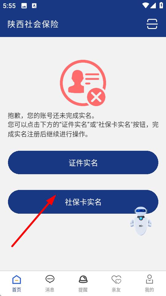 3、完成注冊(cè)跳轉(zhuǎn)登錄,成功登錄后,若遇未實(shí)名提示,在陜西社會(huì)保險(xiǎn)實(shí)名頁(yè)面點(diǎn)擊社??▽?shí)名按鈕,按流程提交社??ㄐ畔⒔壎ǎ瓿蓪?shí)名認(rèn)證環(huán)節(jié)。
