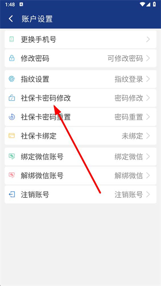 3、在賬戶設(shè)置頁(yè)面中,選擇社??艽a修改選項(xiàng)。