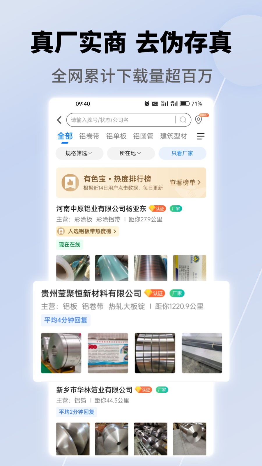 有色寶,原名“鋁信”,有色金屬行業(yè)交易軟件,可以看鋁錠價及其他有色金屬報價,手機買賣鋁錠、鋁板、銅板、鋁帶、銅帶、鋁箔、銅箔、鋁型材、鋁管、銅管、鋁棒、銅棒、鋁排、銅排、鋁圓片、彩涂板、熱軋卷、鑄軋卷等鋁材。