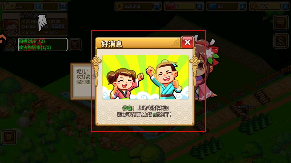 4、成功完成戰(zhàn)斗后,游戲會彈出提示,解鎖同時上場2名武將的功能,可繼續(xù)進(jìn)行后續(xù)游戲內(nèi)容。