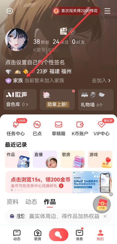 1、打開全民K歌后,進(jìn)入我的頁面,點(diǎn)擊家族的選項(xiàng),進(jìn)入家族廣場的界面。