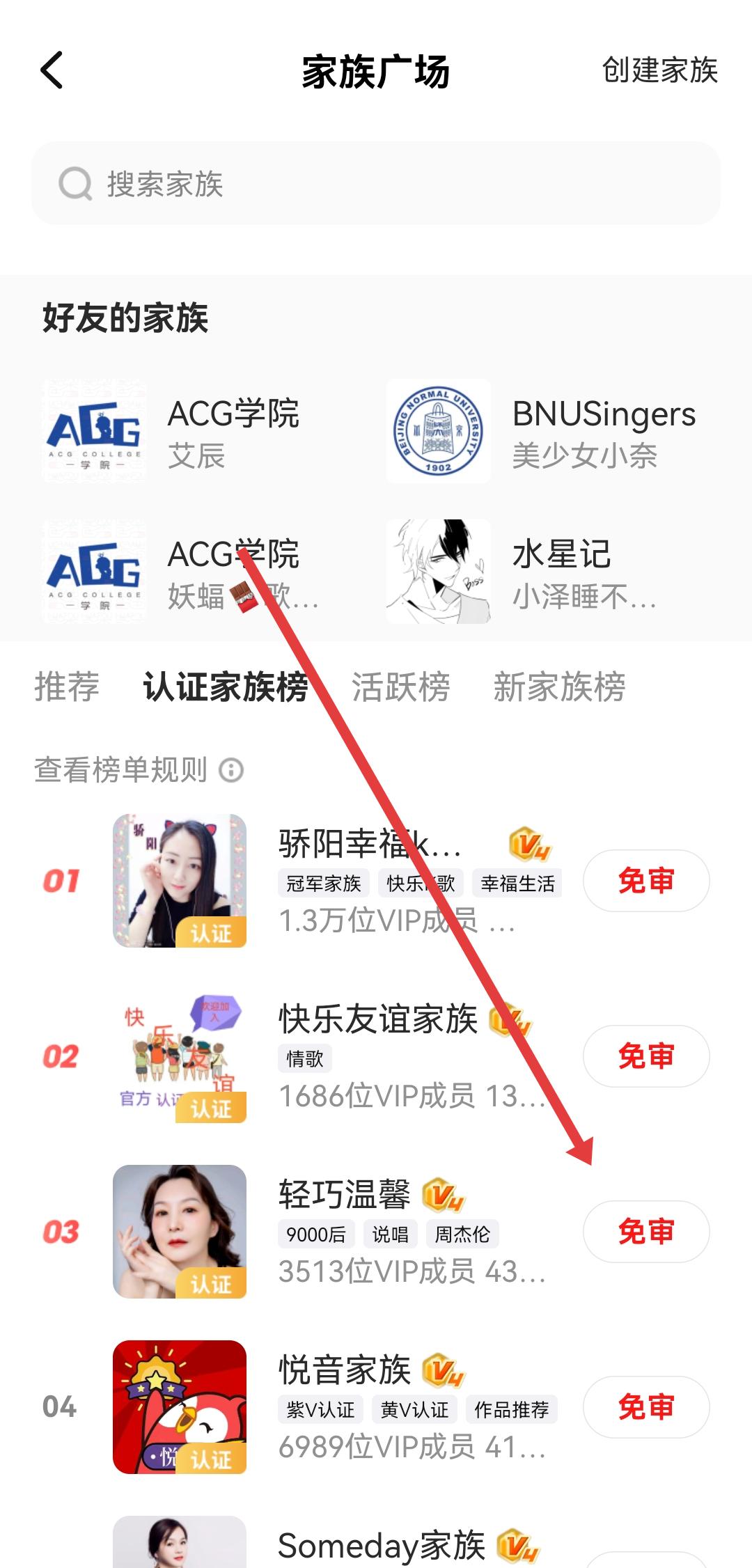2、在家族廣場中,瀏覽推薦、認(rèn)證家族榜、活躍榜等榜單,找到心儀且?guī)в忻鈱徎蛏暾?qǐng)標(biāo)識(shí)的家族。