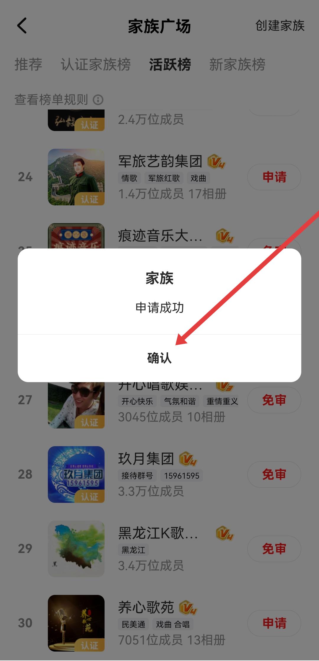 3、點(diǎn)擊目標(biāo)家族旁的免審或申請(qǐng)按鈕,在彈出申請(qǐng)成功提示框后,點(diǎn)擊確認(rèn)等待家族審核或直接加入。