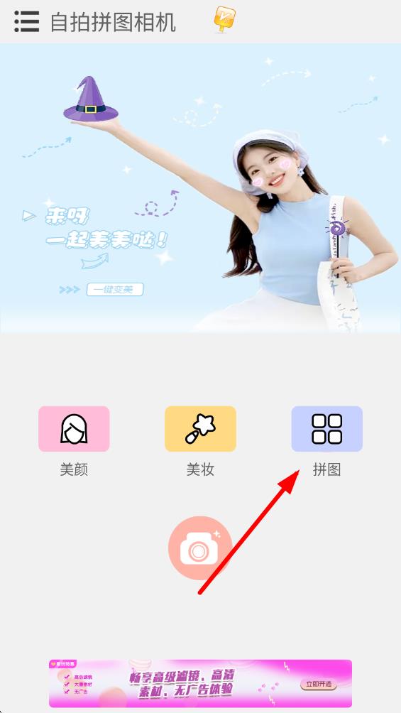 1、打開自拍拼圖相機app后,點擊界面上的拼圖按鈕,進入拼圖操作環(huán)節(jié)。