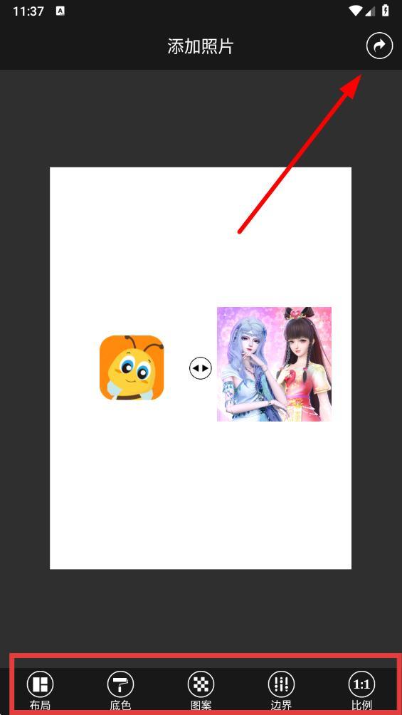 4、照片添加完成后,利用底部功能欄調(diào)整底色、圖案、邊界等,完成后點擊分享圖標旁的下一步。