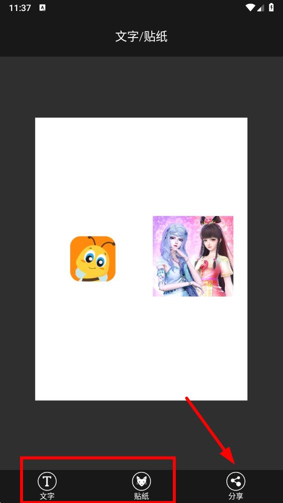 4、在頁面可以利用底部的文字、貼紙等功能裝飾拼圖,裝飾完畢后點擊分享。