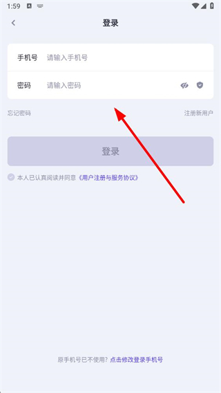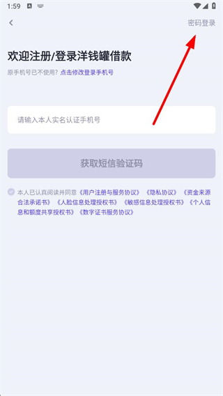 4、在頁面輸入手機號和密碼,勾選同意用戶注冊與服務協(xié)議后,點擊登錄,即可完成洋錢罐借款的密碼登錄操作。
