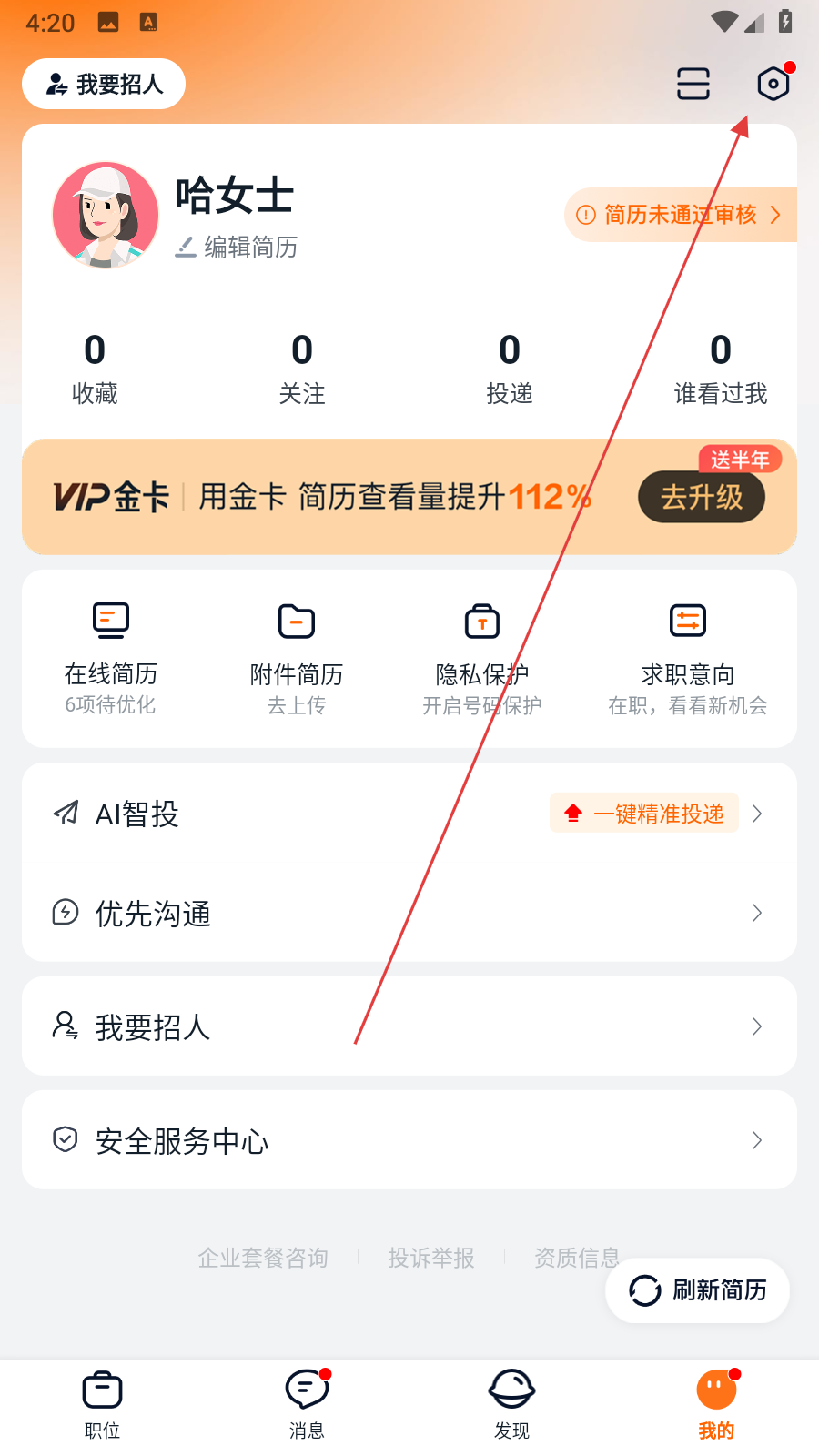 1、打開獵聘APP,進入我的頁面,點擊右上角的設(shè)置圖標。