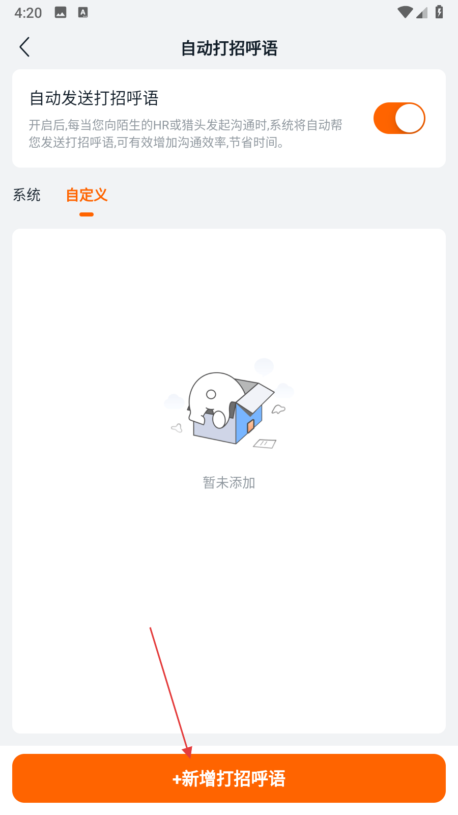 3、進入自動打招呼語頁面后,點擊底部的+新增打招呼語按鈕。