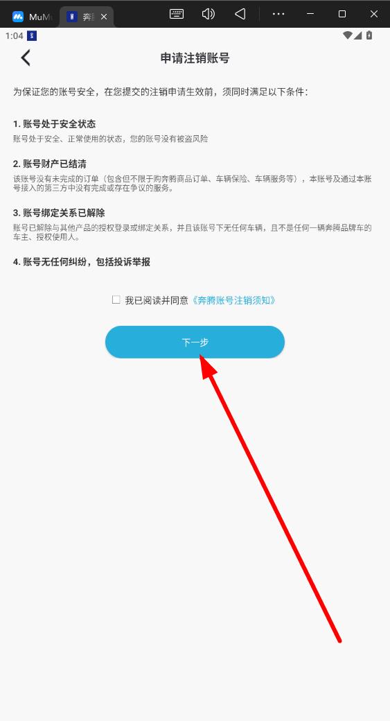 4、在申請(qǐng)注銷(xiāo)賬號(hào)頁(yè)面,閱讀相關(guān)注銷(xiāo)條件,點(diǎn)擊下一步,按提示完成后續(xù)注銷(xiāo)操作。
