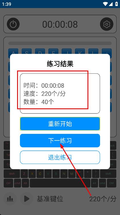 4、在彈出頁面中可以查看結(jié)果,點(diǎn)擊下一練習(xí)即可繼續(xù)練習(xí)。