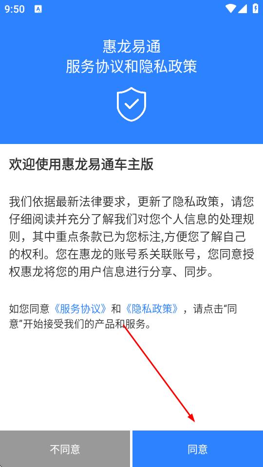 1、打開惠龍易通車主版APP,在服務(wù)協(xié)議和隱私政策頁面點(diǎn)擊同意,進(jìn)入APP。