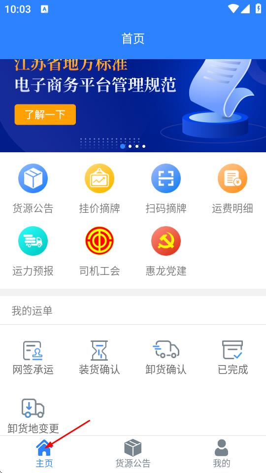 2、進(jìn)入APP首頁,能看到貨源公告、掛價摘牌、掃碼摘牌、運(yùn)費(fèi)明細(xì)、運(yùn)力預(yù)報等功能入口,可查看貨源、了解收入、報備運(yùn)力等。