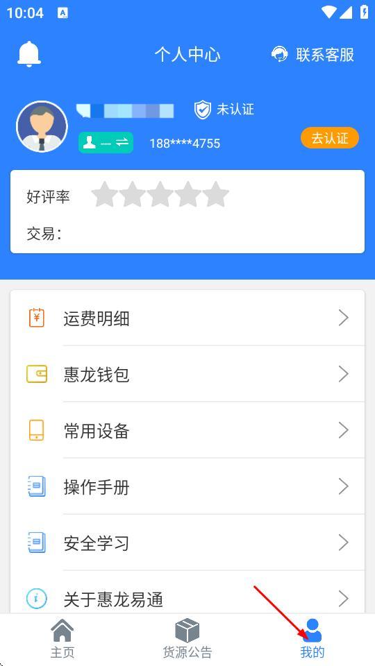 4、點(diǎn)擊底部導(dǎo)航欄我的進(jìn)入個人中心,可查看管理個人信息、好評率,查看運(yùn)費(fèi)明細(xì)、惠龍錢包,管理常用設(shè)備。