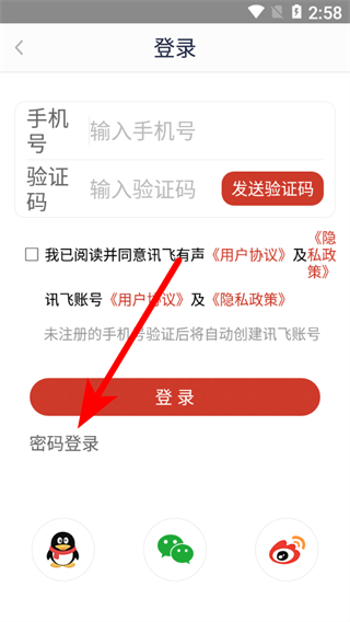 3、在登錄頁面,點擊密碼登錄選項,切換到密碼登錄界面。
