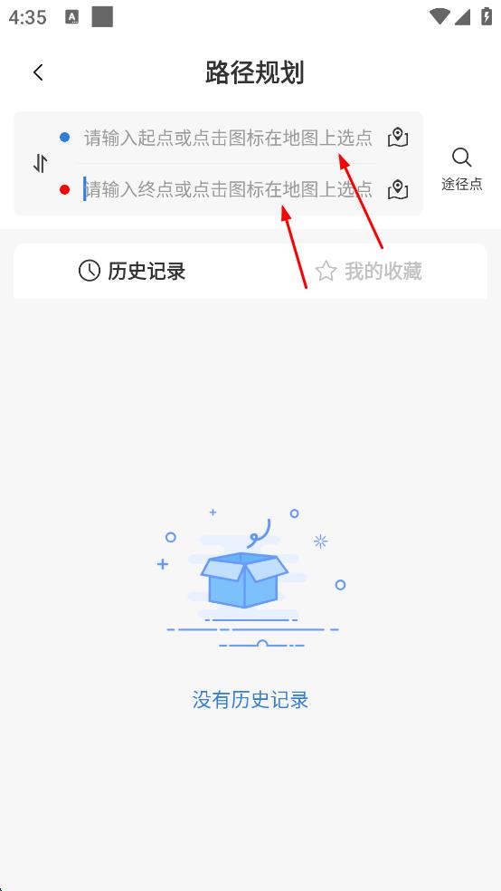 3、在路徑規(guī)劃頁面,分別在起點、終點輸入框填寫地點信息,或點擊對應圖標在地圖選點,設置好后即可進行路徑規(guī)劃操作 。