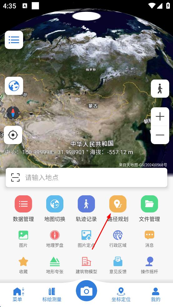 2、在主界面地球地圖展示頁,找到底部功能欄里的“路徑規(guī)劃”圖標并點擊,切換到路徑規(guī)劃操作頁面。