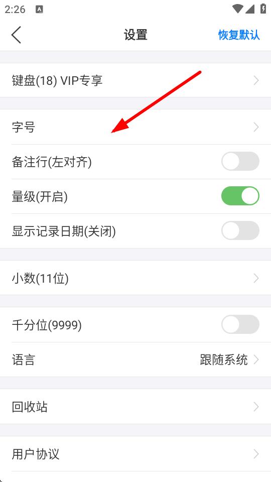 3、在詳細(xì)設(shè)置頁面里,點(diǎn)擊字號(hào)選項(xiàng),進(jìn)入字號(hào)調(diào)整界面。