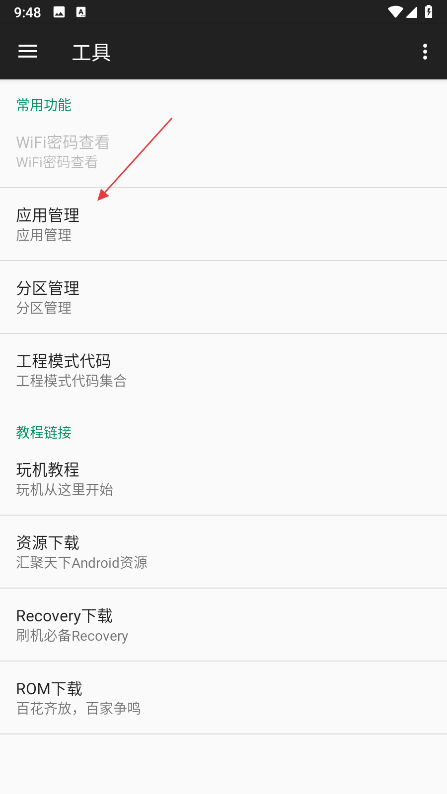 1、打開小歐工程師,進(jìn)入工具頁(yè)面,在頁(yè)面中找到應(yīng)用管理選項(xiàng)并點(diǎn)擊,進(jìn)入應(yīng)用管理列表界面。