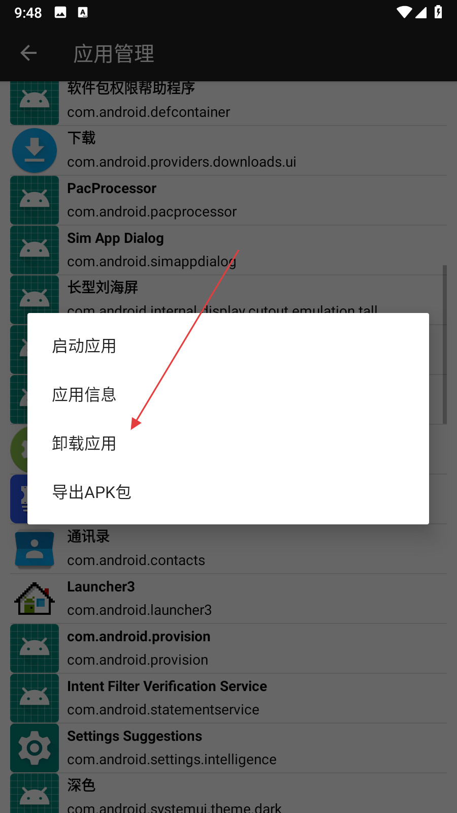 3、在彈出的操作菜單中,點(diǎn)擊卸載應(yīng)用選項(xiàng),此時(shí)會(huì)彈出確認(rèn)框。