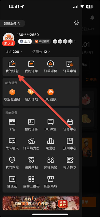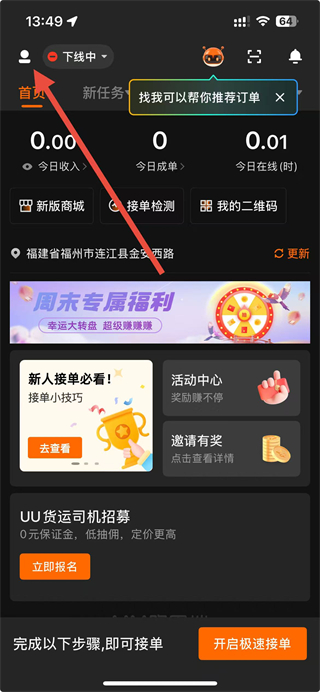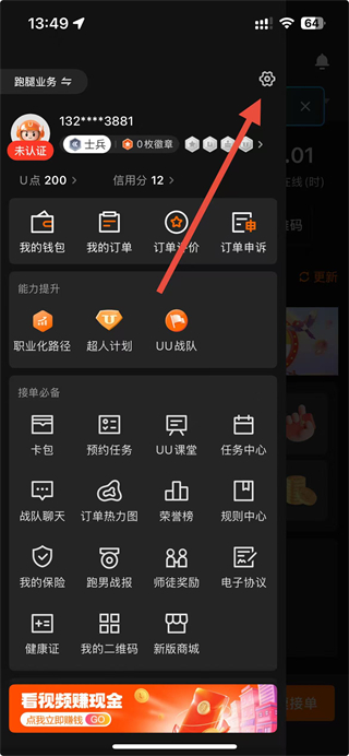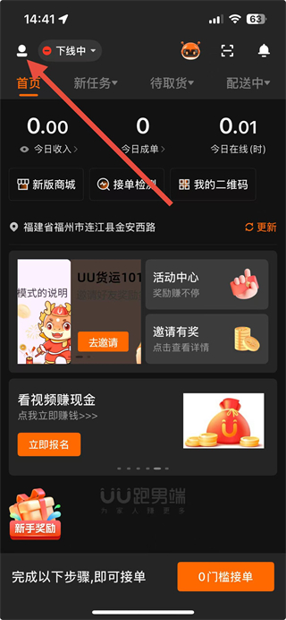 1、在UU跑腿跑男端首頁(yè)點(diǎn)擊左上角頭像區(qū)域,進(jìn)入個(gè)人功能頁(yè)面。