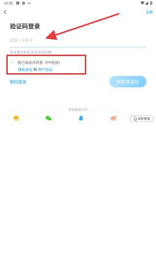3、進(jìn)入登錄頁(yè)面后,可選擇驗(yàn)證碼登錄并勾選閱讀并同意pp視頻隱私政策和用戶協(xié)議。