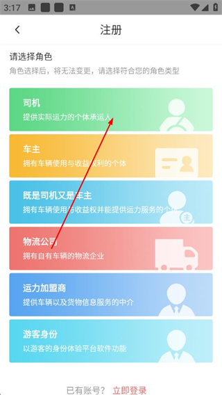 2、在注冊頁面選擇角色,例如司機。