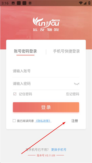 1、打開168運友物流APP,在登錄界面點擊注冊,進入注冊流程。