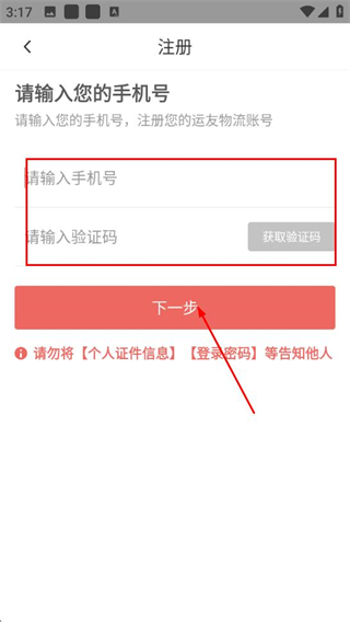 3、輸入手機號,獲取并輸入驗證碼,點擊下一步。