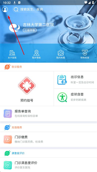 1、打開吉大二院相關(guān)app,點擊首頁左上角的頭像圖標(biāo),進入個人中心頁面。