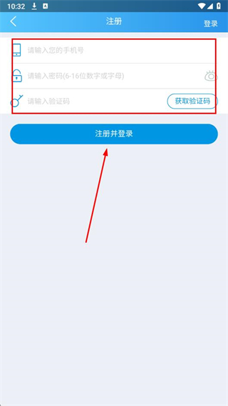 4、在注冊頁面,輸入手機號、驗證碼,設(shè)置密碼,點擊注冊并登錄。