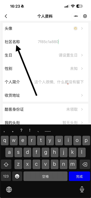 4、在個(gè)人資料頁(yè)面,點(diǎn)擊社區(qū)名稱選項(xiàng),輸入想要修改的新名字后,點(diǎn)擊鍵盤上的完成按鈕即可。
