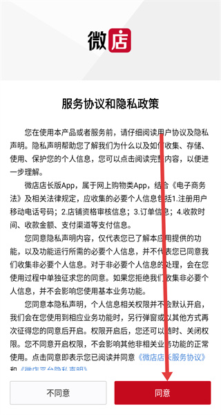 1、打開(kāi)微店APP,在彈出的服務(wù)協(xié)議和隱私政策窗口中點(diǎn)擊同意,進(jìn)入應(yīng)用功能展示頁(yè)面。