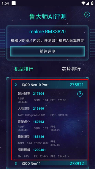 4、繼續(xù)查看第二名iQOO Neo10 Pro+的各項AI性能得分,了解機(jī)型AI運算性能排行情況。