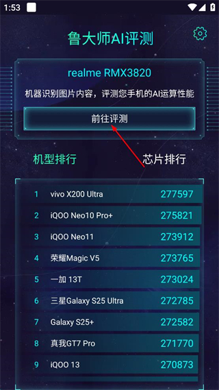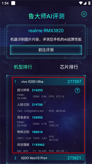 3、評測完成后,返回機(jī)型排行界面,查看第一名vivo X200 Ultra的各項AI性能得分。