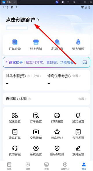 2、在我的頁面頂部位置,找到并點擊創(chuàng)建商戶選項。