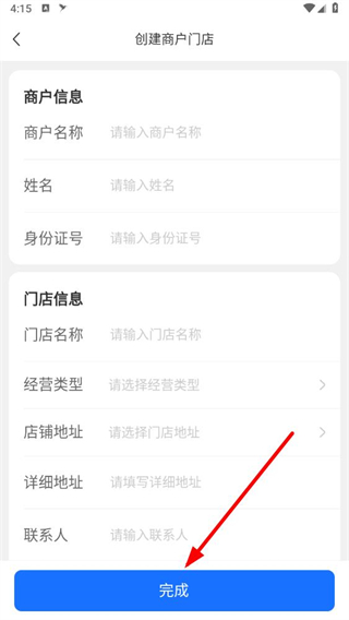 4、在創(chuàng)建商戶門店頁面,填寫商戶信息,完成后點擊完成按鈕,即可完成店鋪創(chuàng)建操作。