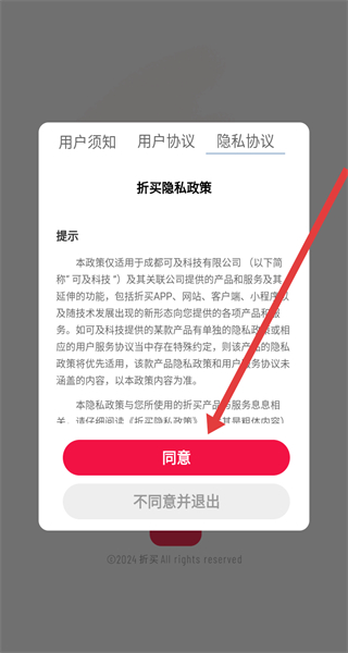 1、點(diǎn)擊“折買隱私政策”彈窗的“同意”,進(jìn)入折買APP首頁(yè)。