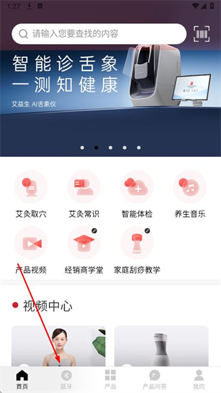 1、打開艾益生APP,點(diǎn)擊底部導(dǎo)航欄中的藍(lán)牙。