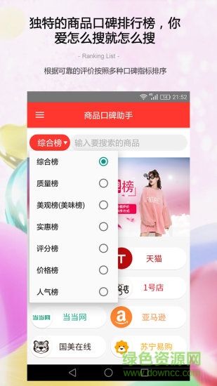 商品口碑助手app是一款網(wǎng)購(gòu)必備神器,提供各大主流購(gòu)物平臺(tái)的商品信息,用戶(hù)在線查看當(dāng)前商品好評(píng)率真實(shí)顯示,貨比三家輕松購(gòu)物,綜合熱銷(xiāo)產(chǎn)品一鍵查詢(xún),歡迎來(lái)綠色資源網(wǎng)下載!
