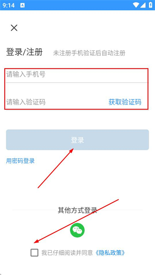 4、輸入手機號碼,獲取驗證碼,勾選隱私政策,點擊登錄按鈕。