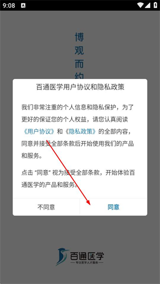 1、打開百通醫(yī)學(xué)APP,在彈出的百通醫(yī)學(xué)用戶協(xié)議和隱私政策界面,點擊同意。