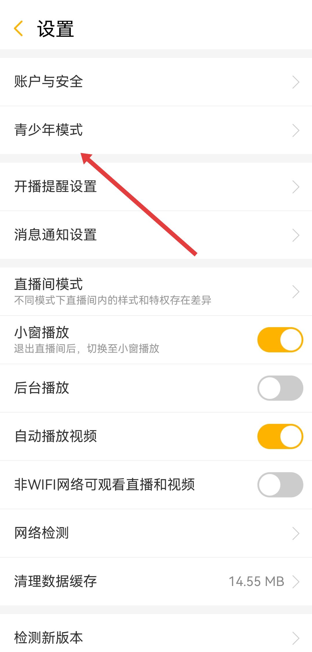 2、在設置頁面中,找到并點擊青少年模式選項,進入青少年模式設置頁。