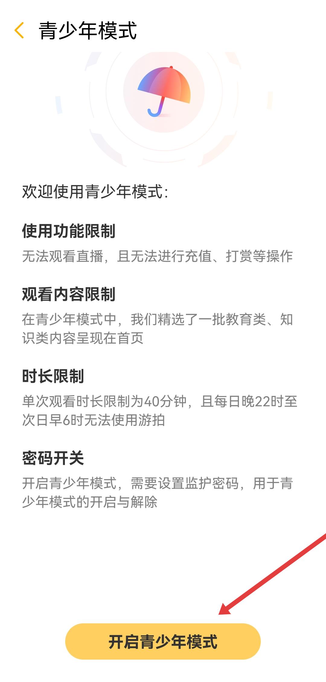 3、在青少年模式說明頁面底部,點擊開啟青少年模式按鈕,進入密碼設置環(huán)節(jié)。