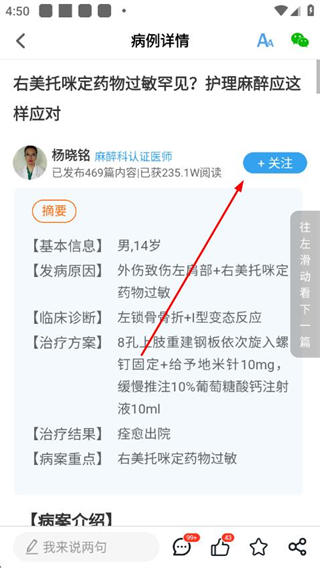 2、在病例詳情頁(yè)找到醫(yī)生信息右側(cè)的+關(guān)注,點(diǎn)擊該按鈕。