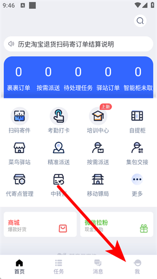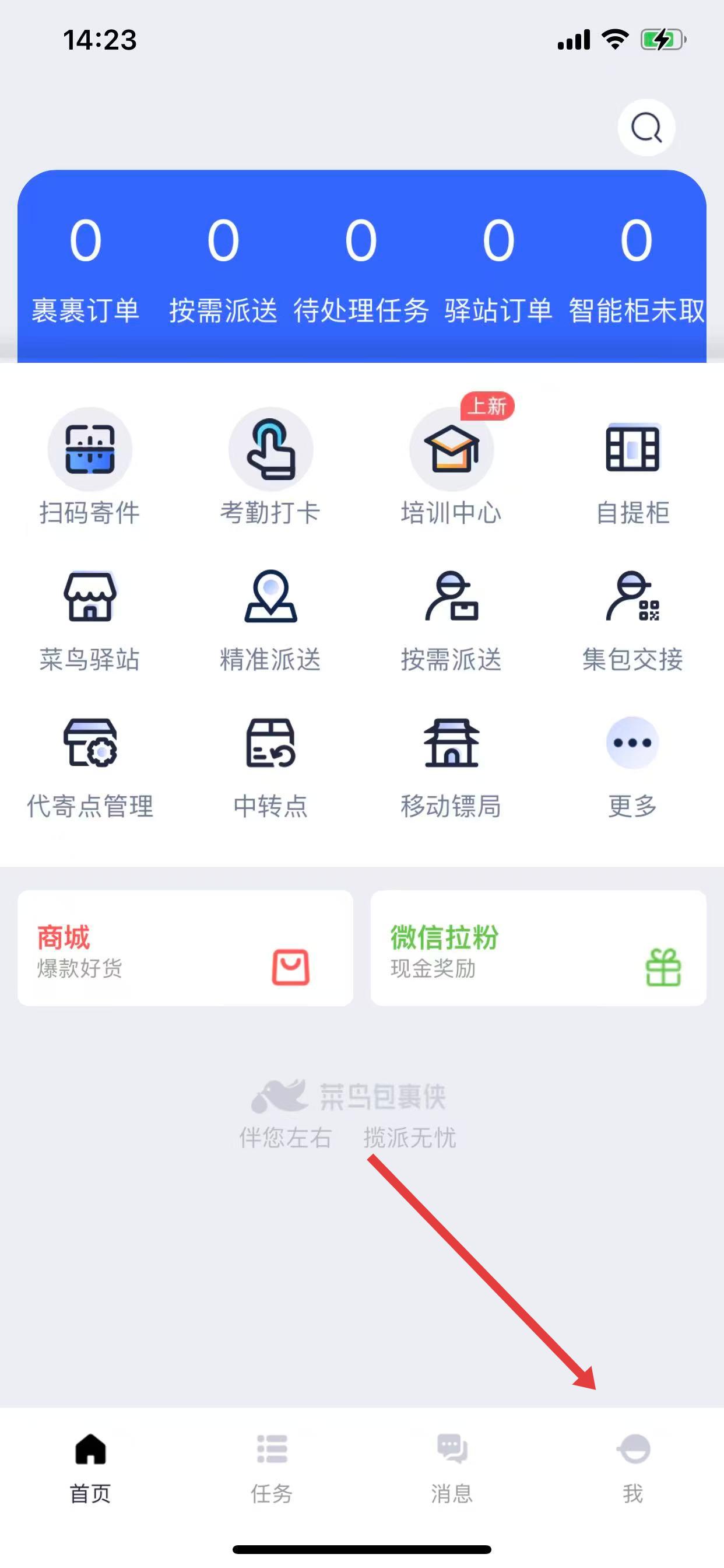 1、打開(kāi)菜鳥包裹俠APP首頁(yè),點(diǎn)擊底部我,進(jìn)入個(gè)人的頁(yè)面。