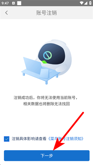 4、在賬號(hào)注銷說(shuō)明頁(yè)面,勾選須知后點(diǎn)擊下一步,按照提示完成注銷。