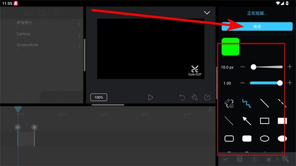 4、在繪畫界面,利用右側(cè)的畫筆大小、顏色、樣式等工具進(jìn)行繪畫創(chuàng)作,完成后點(diǎn)擊完成即可將畫作添加到影片中。
