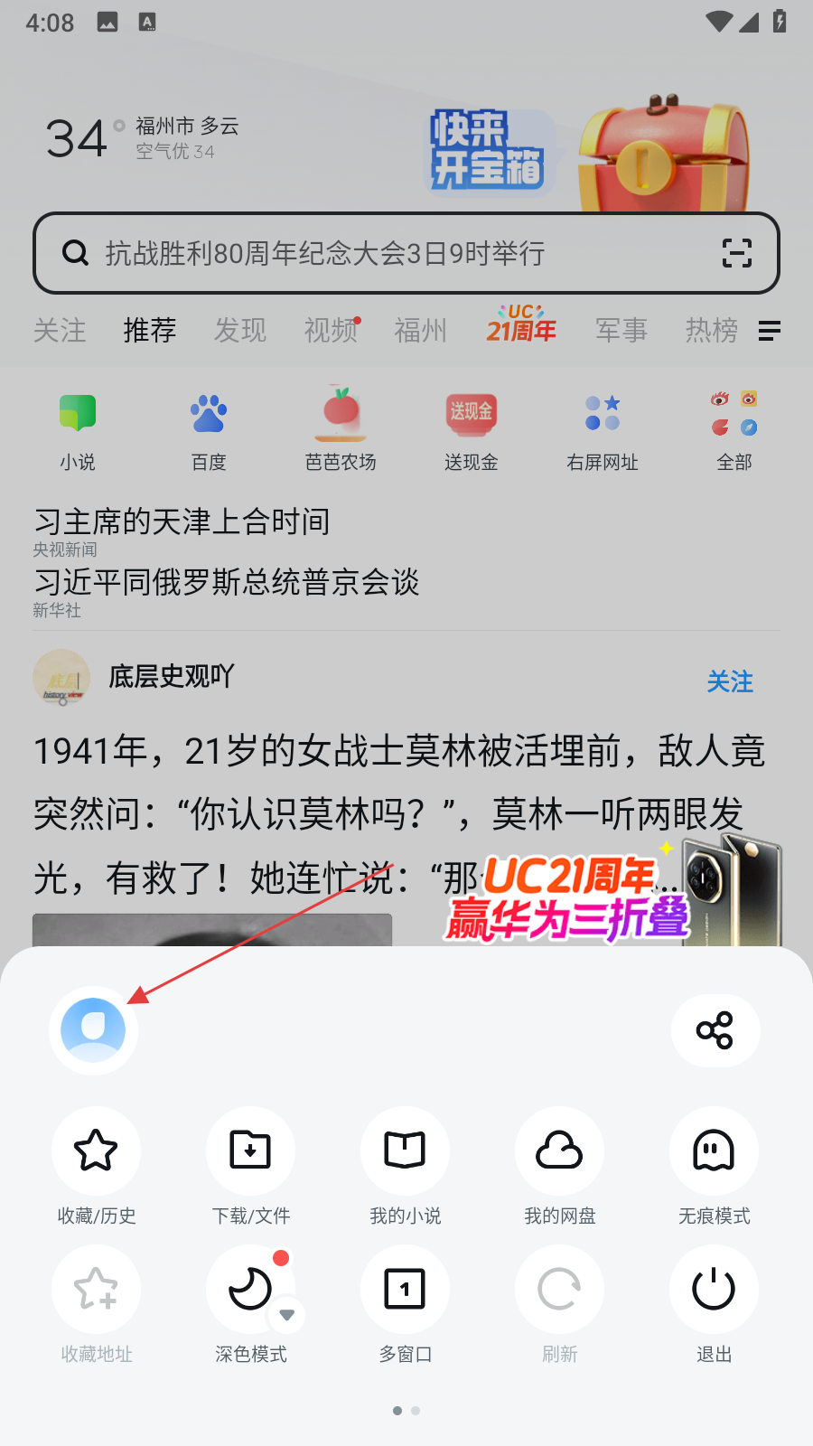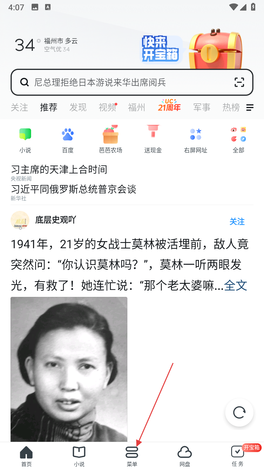 1、打開uc瀏覽器極速版,在底部導(dǎo)航欄點(diǎn)擊中間的菜單。