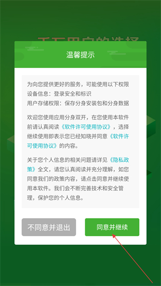 1、打開應(yīng)用分身雙開APP,進(jìn)入時(shí)會(huì)彈出溫馨提示,點(diǎn)擊同意并繼續(xù)的按鈕。